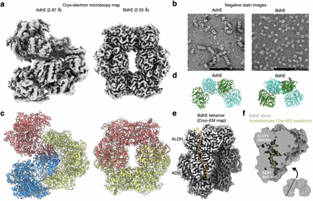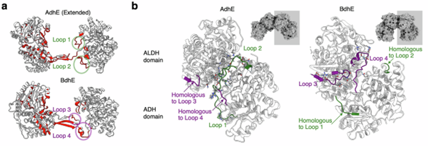 图 3. AdhE 与 BdhE 的冷冻电镜结构揭示结构域间相互作用的趋同性
