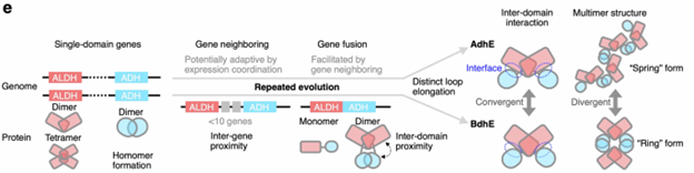 之后,研究人员推测AdhE 和 BdhE 的独立基因融合可能受其祖先 ALDH 和 ADH 基因在基因组中邻近位置的促进,这使得单域基因通过小片段缺失容易融合。邻近基因对通常功能相关并共转录,但在融合前并未形成跨域相互作用。融合后的 BdhE 和 AdhE 通过各自特异的环结构趋同获得 ALDH–ADH 接触,实现底物通道化。祖先单域基因的同源二聚体相互作用为多聚体形成提供基础,而跨域相互作用则是融合后独立演化获得的。