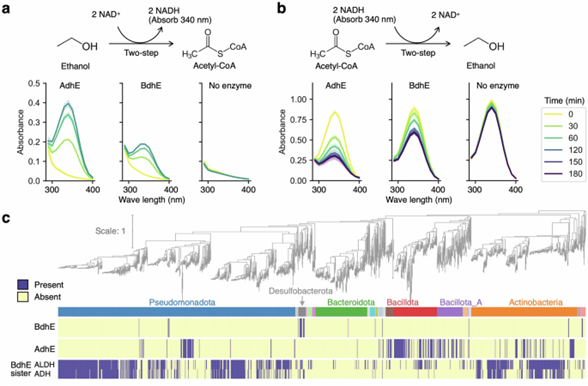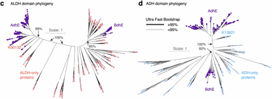 图 2. AdhE 与 BdhE 具有相似酶活性,但系统发育及生态分布不重叠