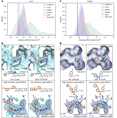 在Brr2抑制剂优化中(图3a-b),ED²Mol基于核心骨架(PDB:5URJ)通过ED引导的片段替换,探索T1197/F1255/K1716残基附近亚口袋,生成分子亲和力优于基线且成功复现先导化合物9(RMSD=0.56Å)。其产生两类优化分子:高相似性类(相似度0.71)通过新增氢键提升亲和力;低相似性类通过磺酰胺基团维持极性作用并扩展疏水接触,证明其多样化片段替换能力。