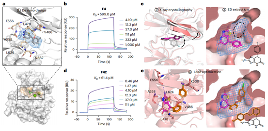 在FGFR3抑制剂开发中(图4a-e),ED²Mol基于ATP口袋(PDB:4K33)生成分子,经筛选得687候选物。化合物F4经SPR验证结合(KD=599.0μM),共晶结构(1.4Å)证实预测一致性(RMSD=2.00Å)及氟苯基诱导构象变化(图4c)。优化后F42(图4d)KD提升至61.4μM(效力提高9.8倍),源于占据L624疏水亚口袋(图4e),证明其高效生成与优化能力。
