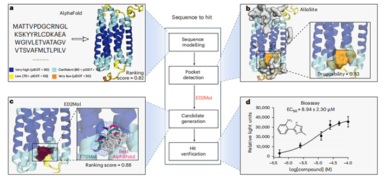 在GPRC5A孤儿受体激活剂开发中(图6a-d),通过整合AlphaFold 3结构预测(图6a)、AlloSite口袋检测(图6b)及ED²Mol分子生成,构建“序列到命中”框架。筛选获1,603候选物,化合物A4因结合模式与预测一致(RMSD=1.48Å)及合成可行性被选中(图6c)。实验验证A4为激活剂(EC50=8.94μM)(图6d),证明其能破解孤儿受体药物发现难题。
