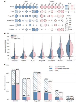 ED²Mol在口袋感知生成中全面领先(图2a-c):其口袋占有率密度(28.2)和覆盖率(84%)显著优于基线模型;配体效率(LE)在DUD-E/ASB-E达67.3%/68.9%;结合有效性(PoseBusters)达97.3%,冲突与失真最少;重新对接稳定性最高(图2b),RMSD<2Å的姿势保真度超次优模型12.7-15.9%;最终可靠成功率34.4%(图2c),为基线两倍以上,证明其高质量配体生成能力。