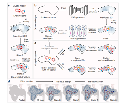 ED²Mol是一种基于电子密度(ED)的结构感知深度生成模型,其通过变分自编码器(VAE)从口袋结构推断配体ED分布(图1b),并采用峰值密度搜索算法拟合核心,结合等变图神经网络(EGNN)迭代扩展片段至未占据ED区域(图1b)。该模型支持以预定义核心为基础进行片段级优化(图1c),具备生成多样化定制先导化合物的能力(图1d)。