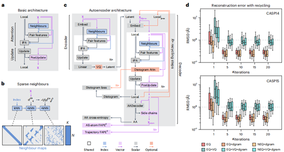 模型架构基于稀疏等变变换器(图1a),通过限制每个残基的注意力计算至其局部邻居(图1b),将复杂度从O(N²)降至O(N·K)。该架构采用IPA层和GeGLU前馈层,直接更新原子位置并动态计算框架以保持等变性。在PDB数据上训练的自编码器模型(图1c)验证了其有效性:所有变体在CASP14/15测试集上经少量迭代即可实现<1å的重建精度(图1d),最终选定无需距离图邻居的等变版本作为基础架构。<>