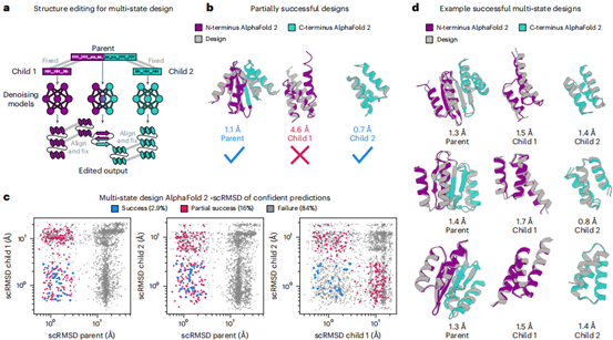 通过结构编辑耦合多个去噪过程(图6a),作者成功解决了多态蛋白设计任务:生成的主链-序列对在母体与子体状态间实现构象转换(β折叠→α螺旋)。其中2.9%的主链完全满足设计标准(AlphaFold RMSD<3.0>75),成功率较ProteinGenerator提升6倍(图6b,d)。仅使用二级结构条件化时成功率降至0.4%,证明结构编辑是性能提升的关键。该工作首次实现了基于主链去噪模型的多态设计。