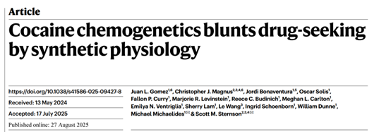 2025年8月27日,霍华德休斯医学研究所Scott M. Sternson团队和美国国家药物滥用研究所Michael Michaelides在Nature上发表了题为“Cocaine chemogenetics blunts drug-seeking by synthetic physiology”的研究文章。该研究通过化学遗传学方法来抑制可卡因成瘾,开发出了两种可卡因激活的离子通道,并基于该通道在关键神经环路中植入可卡因成瘾的对抗性信号,直接打破可卡因渴求行为的正反馈循环。该研究为成瘾研究提供了新的视角和工具,具有重要的科学意义和应用前景。
