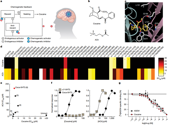 首先,研究团队使用蛋白质工程技术创建了选择性对可卡因敏感的离子通道。通过将α7烟碱型乙酰胆碱受体(α7nAChR)的配体结合域(LBD)与5-羟色胺受体(5-HT3)或甘氨酸受体(GlyR)的离子通道结构域(IPD)拼接,设计了两种类型的可卡因门控通道,兴奋性通道coca-5HT3和抑制性通道coca-GlyR。