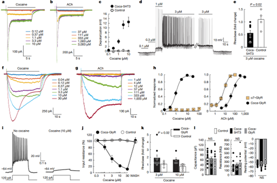 为了测试通道激活功能,研究团队首先进行了细胞实验。在HEK293细胞中进行全细胞电压钳记录,验证了coca-5HT3和coca-GlyR通道的可卡因激活特性。其中兴奋性通道coca-5HT3可被可卡因激活,进而引起神经元去极化并触发动作电位;而抑制性通道coca-GlyR被激活后则会抑制神经元活动(图3)。