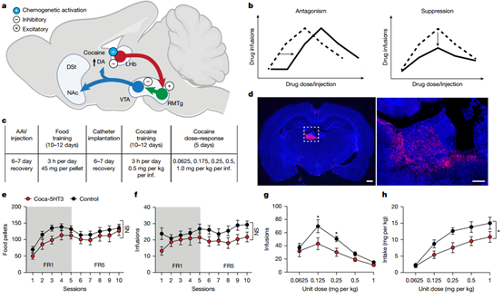 图4. LHb神经元中的可卡因化学遗传学抑制可卡因渴求