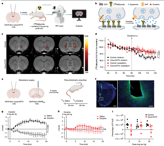 此外,研究团队进行了成像实验,使用正电子发射断层扫描(PET)和纤维光度测量技术,直观测量可卡因诱导的多巴胺释放变化。结果显示,可卡因显著降低了对照组大鼠伏隔核和背侧纹状体的示踪剂结合,提示多巴胺释放增加,而coca-5HT3表达组的这一效应则被显著抑制(图5),意味着由可卡因引起的正反馈循环被阻断。光纤测量进一步证实,对照组大鼠在可卡因注射后出现GRABDA信号的显著升高,而实验组则基本阻断了该反应。