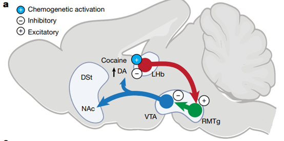外侧缰核(LHb)作为大脑关键的“抗奖赏中枢”,它的核心功能是对抗过度兴奋:在正常奖赏过后,LHb的激活有助于让多巴胺水平回落到基线,防止奖赏信号过度持续,从而保持我们对奖赏的敏感度。LHb通过激活前脑内侧束核(RMTg)和腹侧被盖区(VTA)的GABA神经元来抑制VTA的多巴胺神经元(图1)。在体内LHb通常受到可卡因的抑制,部分原因是多巴胺的升高作用于LHb神经元中的多巴胺2型受体导致LHb的抑制,从而促进了可卡因的自我给药。