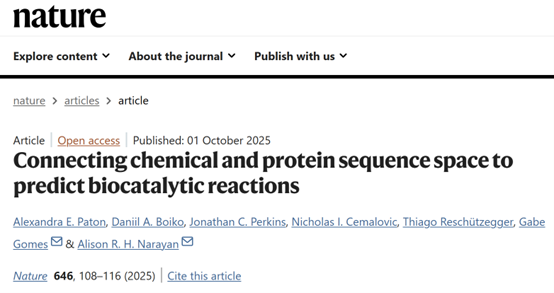 2025年10月1日,美国密歇根大学Alison R. H. Narayan和卡耐基梅隆大学Gabe Gomes团队合作在顶级期刊《Nature》上发表了一篇题为“Connecting chemical and protein sequence space to predict biocatalytic reactions”的研究,系统介绍其设计思路、数据构建、模型开发与应用前景。研究团队首先构建了大规模酶-底物反应数据库,覆盖数百位酶与上百种底物,从而填补此前 “酶-底物配对稀疏” 的空白。继而,基于该数据库开发了推荐型机器学习平台 CATNIP,使得给定底物可预测适配酶、或给定酶可预测潜在底物。通过该研究可见,生物催化已迈入 “从经验筛选转向数据驱动推荐” 的新阶段,对催化剂发现、合成路线设计、绿色化学发展具有重要意义。