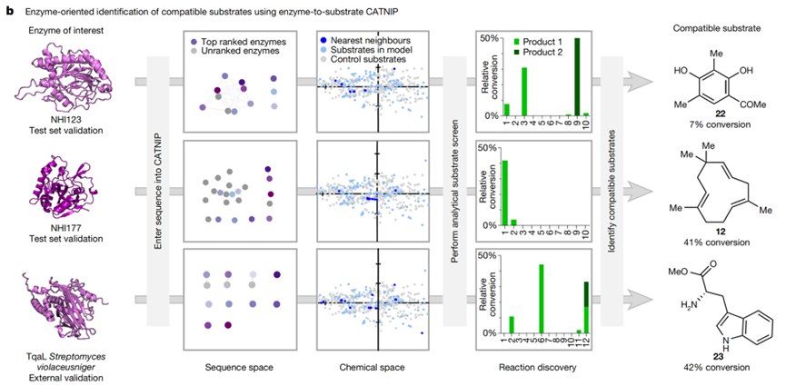 通过这种思路,研究团队不仅生成了丰富的数据资源,还通过模型构建完成“化学空间到蛋白序列空间”的链接,使得生物催化的酶选择从传统“经验+筛选”转变为“数据驱动荐”。