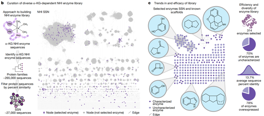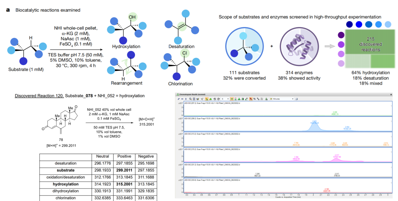 研究团队选择了一组 α-酮戊二酸(α-KG)依赖非血红素铁(NHI)酶作为研究对象,构建酶库,并对底物库中的超过 100 种分子进行反应测试,以生成大量酶-底物配对数据。该过程通过高通量自动化平台、96孔板或更高通量微孔体系、统一反应条件、标准化分析(如 LC-MS)进行,从而为数据驱动分析奠定基础。此阶段的目的不仅是生成阳性反应(酶催化成功)数据,还包括无反应/弱反应的负样本,为后续模型训练提供更全面的数据基础。