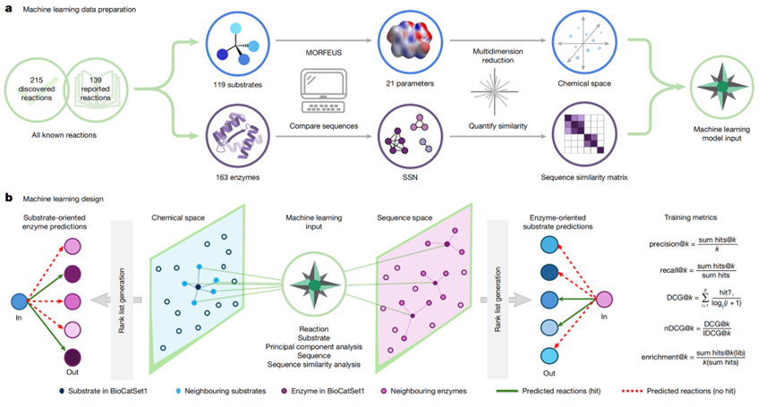 生物催化因其条件温和、催化选择性高以及绿色环保等优点,正日益成为合成化学、制药、精细化学乃至材料科学中的重要工具。然而,尽管酶催化具备这些显著优势,其在新底物、新反应通路中的广泛应用仍然面临重大瓶颈。首先,已知酶-底物配对的数据极其有限:大部分酶的底物谱未知,大量可催化潜力尚未被挖掘。其次,传统酶催化探索往往依赖大规模实验筛选、酶突变优化或工程进化,这不仅耗时耗力,而且实际成功率较低。从化学空间到蛋白序列空间之间,缺乏足够连接“哪个酶能催化哪个底物”的映射,使得科研人员在实际合成规划中往往需要盲目尝试、成本高风险大。在这样的背景下,Alison R. H. Narayan研究团队提出了一个核心动机:构建一个高质量、广覆盖的酶-底物连接数据库,并利用机器学习模型将化学空间与蛋白序列空间“连接”起来,从而实现从底物到酶、或酶到底物的预测推荐。换句话说,他们希望从“我有这个化合物,哪个酶可以催化?”或“我有这个酶,它可能催化哪些尚未尝试的底物?”的角度,为生物催化领域提供一种系统化、可扩展、数据驱动的新范式。