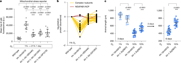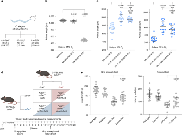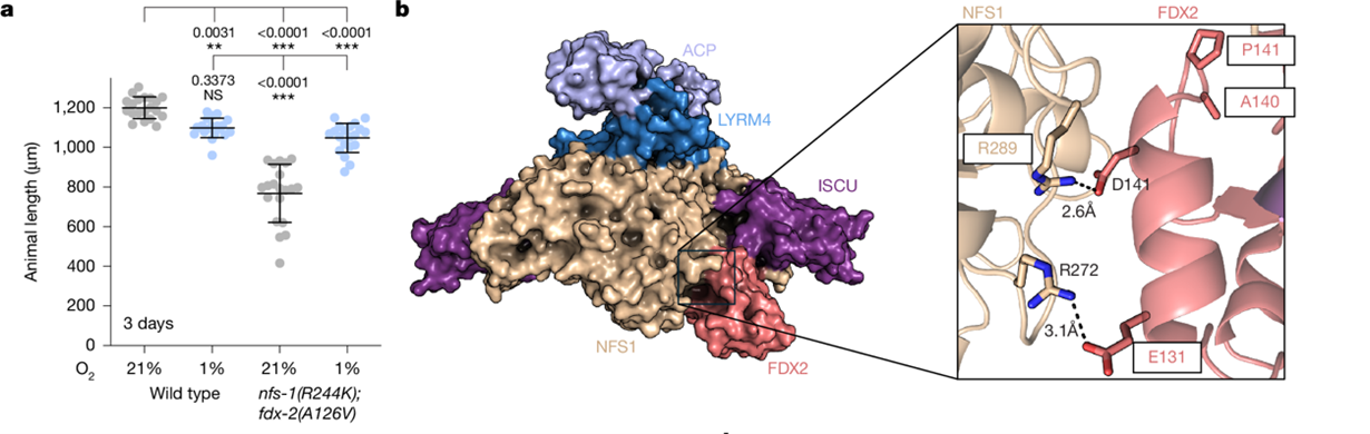 研究人员首先利用了 frataxin/frh-1 空突变秀丽隐杆线虫在低氧条件下可存活的特性,开展正向遗传筛选,鉴定能够使其在非许可性氧条件下恢复生长的抑制突变(图1a)。全基因组测序显示,这些显性抑制突变定位于铁–硫簇组装复合物中的 nfs-1 或 fdx-2 基因,且均为高度保守残基上的错义突变(图1b)。通过 CRISPR 重建实验验证,这些突变可在常氧甚至高氧条件下部分恢复 frataxin 缺失线虫的生长和发育缺陷(图1c)。这一结果表明,调节铁–硫簇组装复合物关键组分的功能可在一定程度上绕过对 frataxin 的依赖。