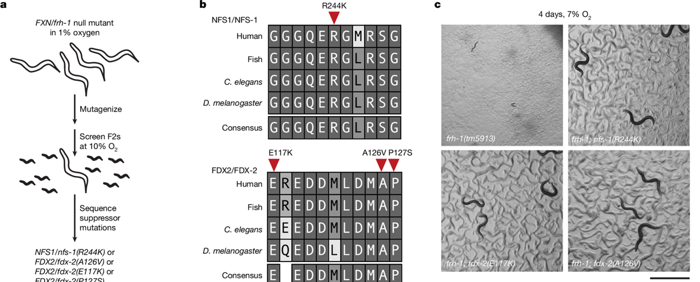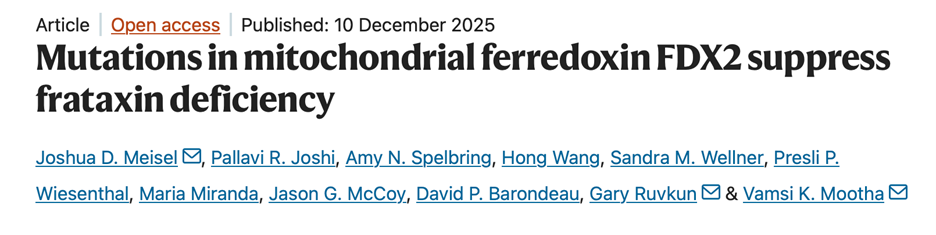 来自哈佛医学院Vamsi K. Mootha和Gary Ruvkun团队合作近日在Nature上发表研究,研究利用秀丽隐杆线虫(C.elegans)开展全基因组正向遗传筛选,鉴定出一个能够绕过 frataxin 需求,恢复 Fe–S 簇合成并缓解弗里德赖希共济失调相关表型的抑制突变。