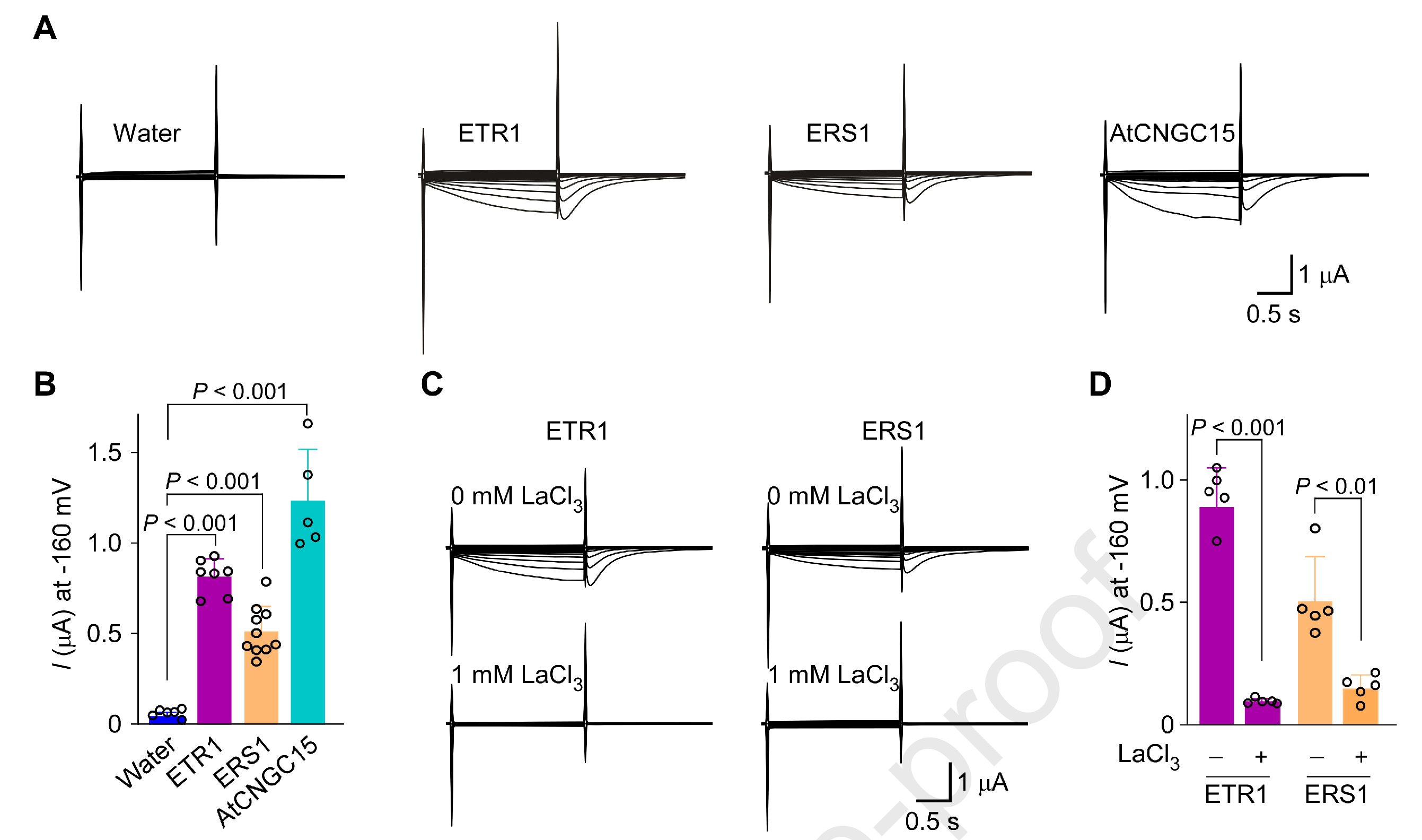 随后作者把5个拟南芥乙烯受体分别在爪蟾卵母细胞表达并做膜片钳实验:ETR1与ERS1出现内向Ca²⁺电流;加入外源Ca²⁺通道阻断剂La³⁺后电流被消除,具有典型的钙离子通道特征;而ETR2/ERS2/EIN4检测不到相应Ca²⁺电流——也就是“I亚家族能导钙,II亚家族不导”。