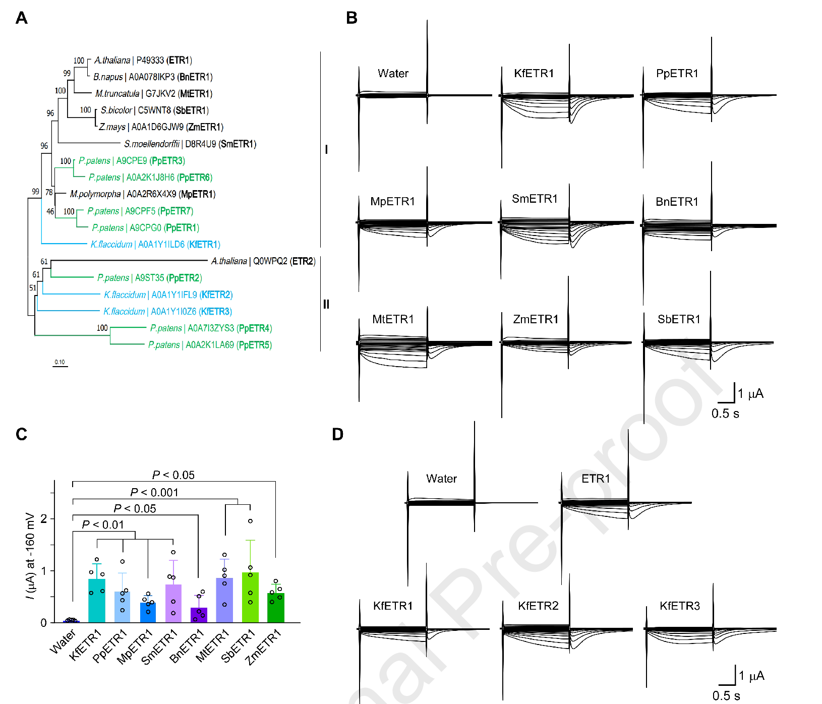 作者挑选了从藻类到苔藓、地钱、卷柏,再到单子叶/双子叶等多个类群的ETR1同源蛋白,在卵母细胞中测试后发现:所有被检测的ETR1同源物都能产生清晰的Ca²⁺电流,提示这种功能可能起源很早,并在绿色谱系中保留下来。