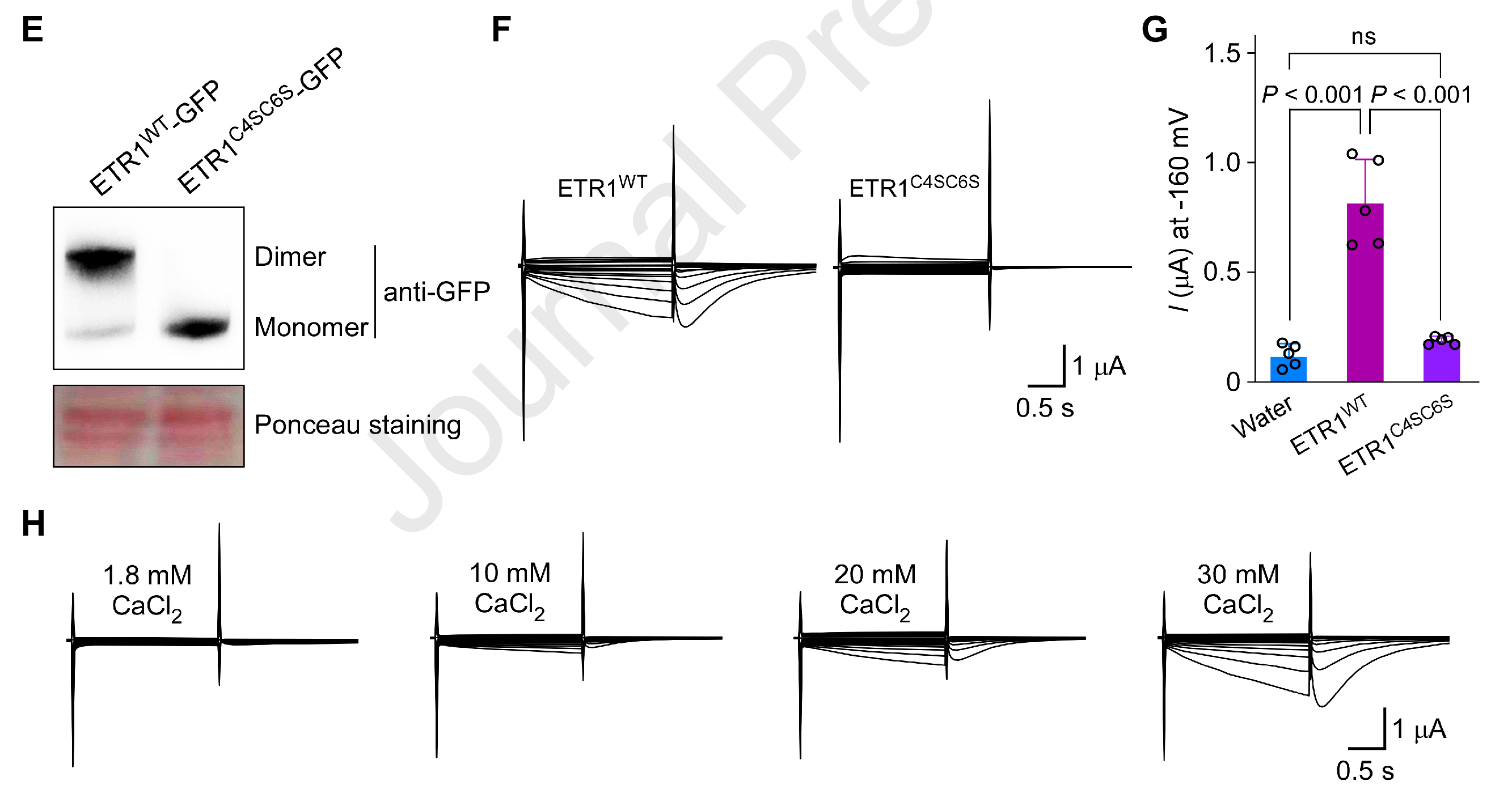 ETR1以同源二聚体作为基本功能单元。作者把ETR1 N端参与二聚化的Cys4/Cys6突变为Ser以破坏二聚化:结果二聚体只在WT中形成,而突变体既不形成二聚体,也丧失Ca²⁺通透性。