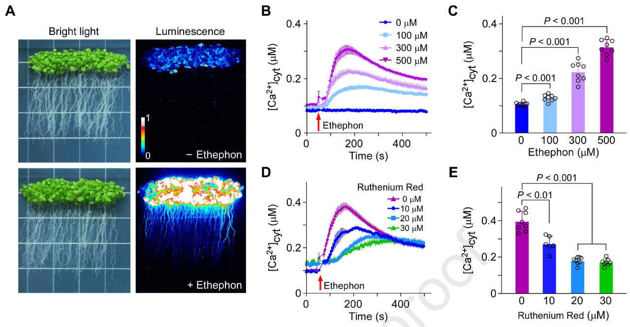 乙烯是植物最经典的气体激素之一,参与生长发育与逆境响应;在拟南芥中,乙烯由内质网膜上的5个乙烯受体感知,并按序列特征分成I亚家族(ETR1、ERS1)与II亚家族(ETR2、ERS2、EIN4)。另一方面,Ca²⁺是植物细胞里最重要的第二信使之一,很多刺激(包括激素)都会引发胞质Ca²⁺瞬变;早在30多年前就有人发现乙烯响应需要Ca²⁺,也有人通过膜片钳观察到乙烯能激活Ca²⁺通道并抬升胞质Ca²⁺,但是具体乙烯诱导Ca²⁺信号的分子来源长期未知。