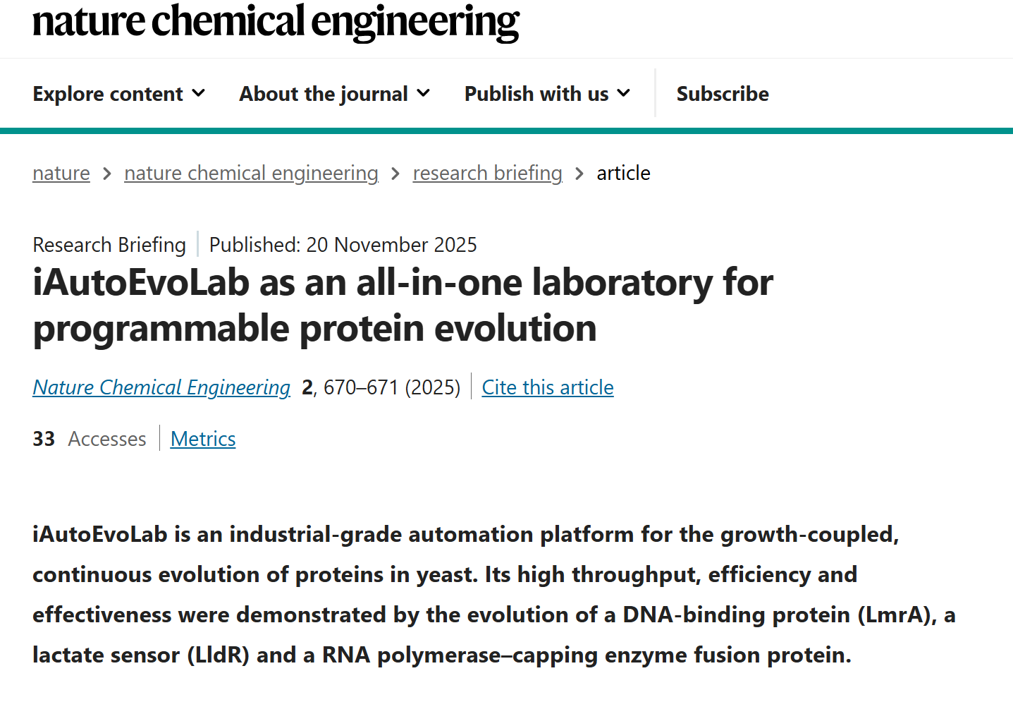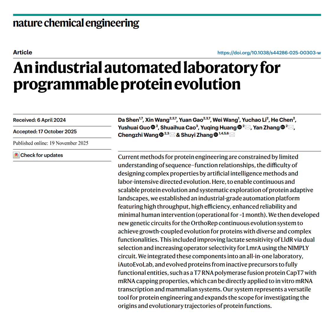 2025年11月19日,清华大学药学院/北京生物结构前沿研究中心张数一团队在Nature Chemical Engineering杂志发表题为An industrial automated laboratory for programmable protein evolution 的封面研究论文,开发了一种工业自动化尺度的蛋白质编程进化实验室iAutoEvoLab,同期杂志还做了研究简报的专门报道:iAutoEvoLab as an all-in-one laboratory for programmable protein evolution。