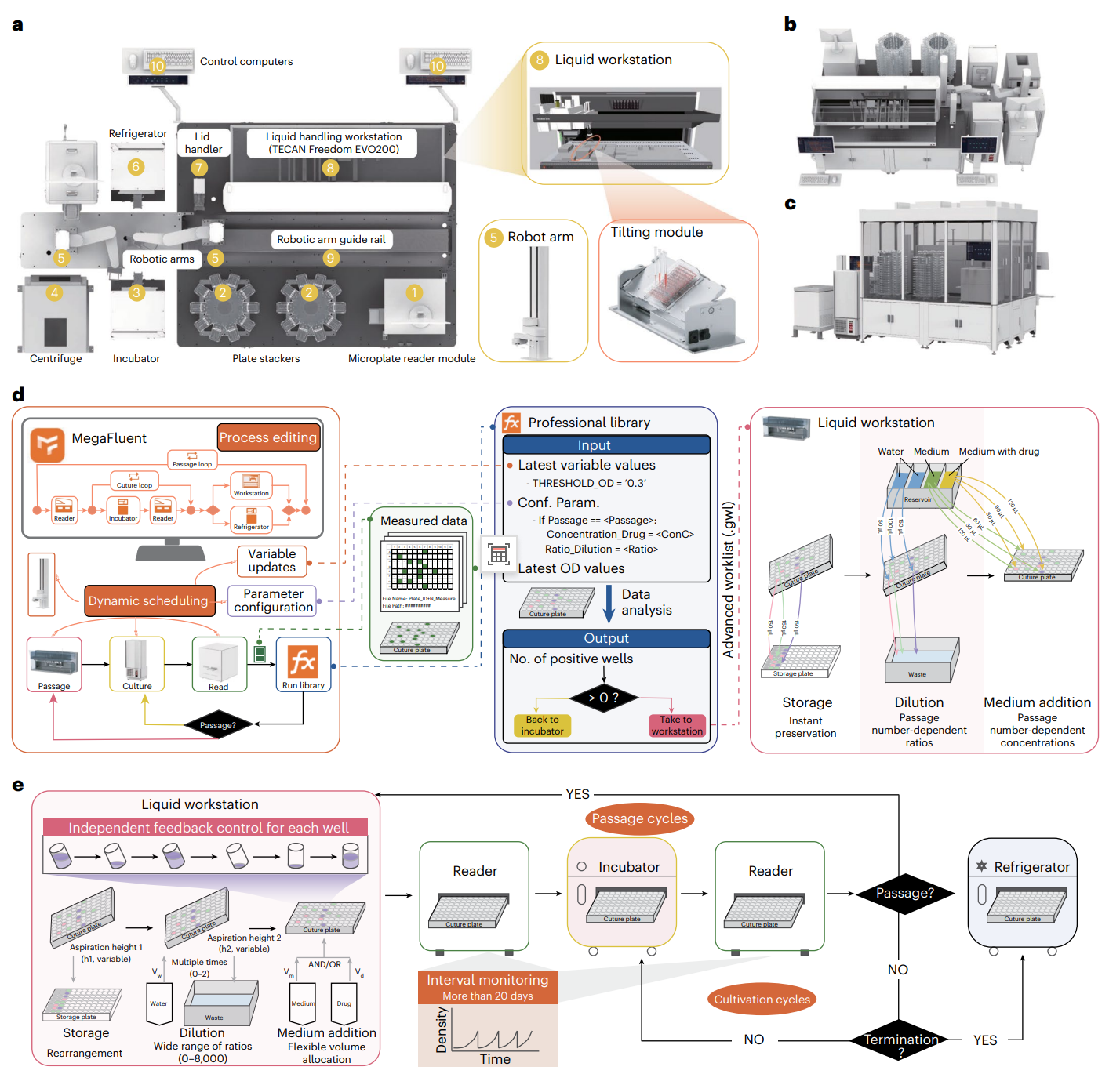 硬件方面,iAutoEvoLab无缝集成了包括液体处理工作站、培养箱、自动化机械臂、酶标仪、冰箱和计算控制系统等一系列关键组件。所有核心设备安置在一个半封闭环境中,除培养箱和冰箱等设备外,整套系统处于无菌环境,防止反应池受到污染。在软件方面,MegaFluent 控制软件负责协调和执行整个工作流程。硬件设备获得读数以后,由MegaFluent进行处理和评估,并根据结果对流程分支进行决策,以完成后续诸如保存培养物、传代、稀释、更换培养基及调节筛选压力的一系列流程。