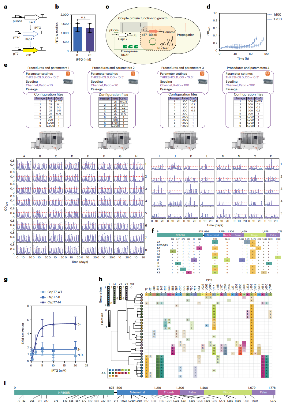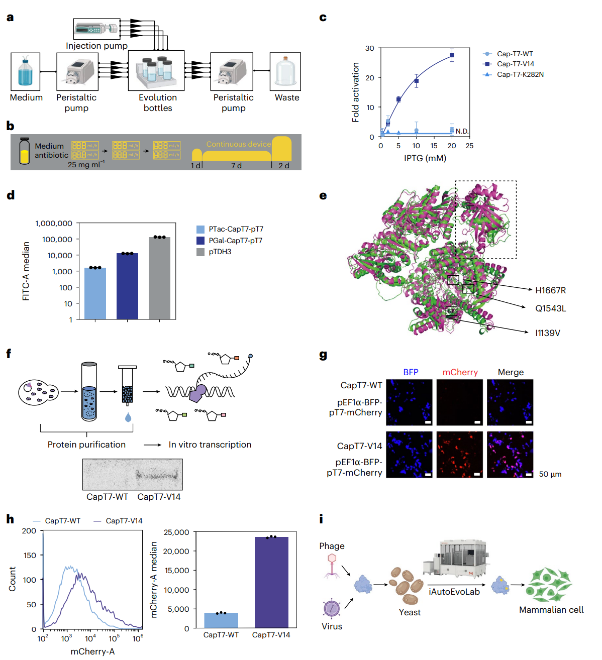利用该系统对活性近乎为零的前体CapT7进行蛋白质功能进化。为了赋予T7 RNAP加帽能力,以扩大其应用效果,将非洲猪瘟病毒的加帽酶与其进行融合,有望应用于哺乳动物细胞中的正交基因表达和疫苗开发等领域。在该平台上进行了一个完全自动化多组平行的定向进化过程,在96孔板中并行启动>100条独立进化线,每天9个循环、连续25天。再接入连续流式装置追加10天高浓度筛选,最终获得变体CapT7-V14。该变体在酵母内使靶基因表达提升30倍;在体外转录反应中可合成带帽mRNA;在HEK293T细胞中,其驱动的荧光蛋白水平与CMV、EF1α等哺乳动物强启动子相当,实现“原核启动子直接用于人源细胞”的跨界表达。