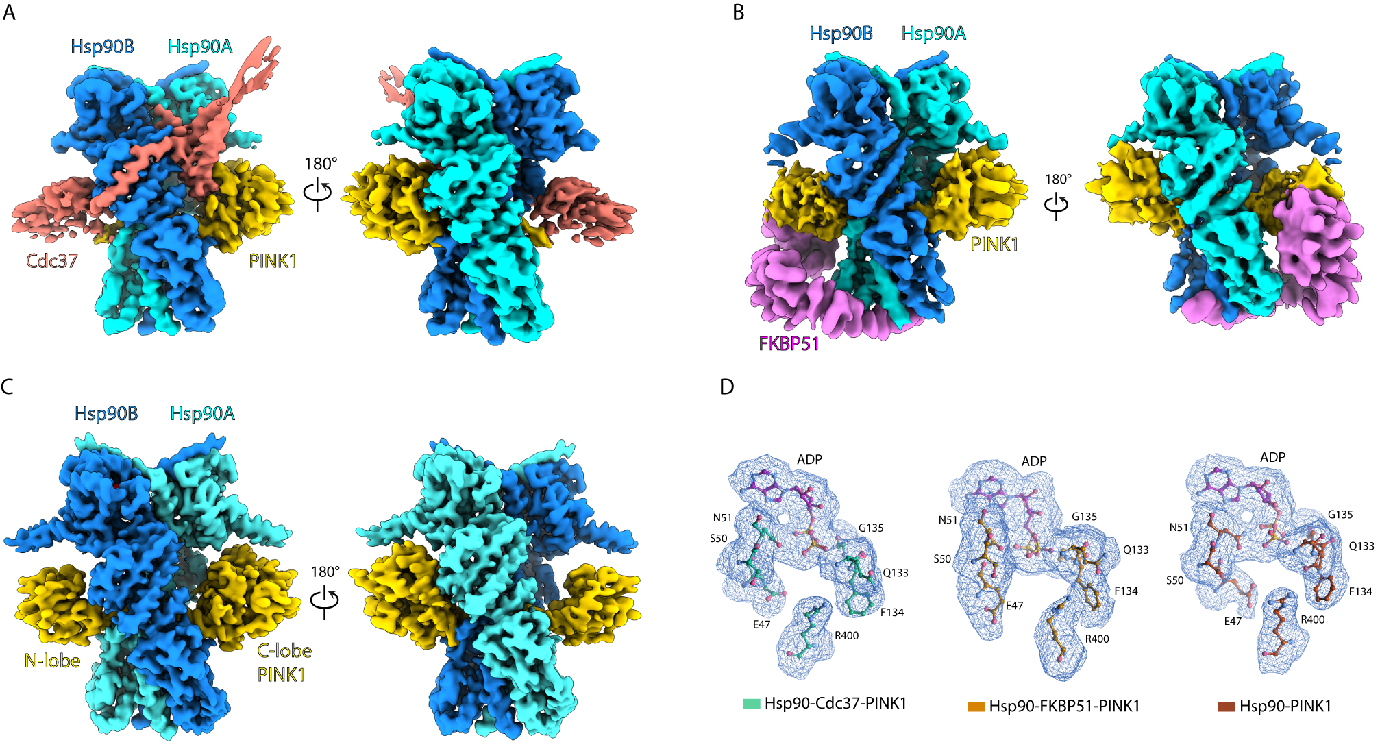 图1.(A) Hsp90-CDC37-PINK1复合物电镜密度图。(B)Hsp90-FKBP51-PINK1复合物电镜密度图。(C)Hsp90-PINK1复合物电镜密度图。(D)复合物中ADP密度图