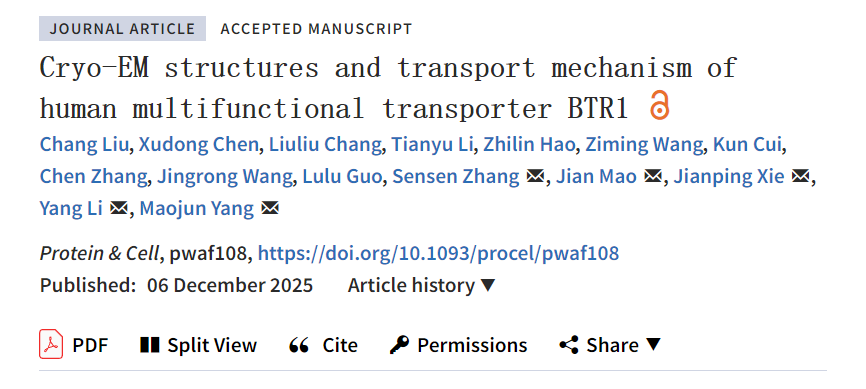 2025年12月6日,清华大学生命科学学院/北京生物结构前沿研究中心杨茂君教授研究团队在《Protein & Cell》杂志上在线发表了题为“Cryo-EM structures and transport mechanism of human multifunctional transporter BTR1”的研究论文。该研究系统解析了人源BTR1蛋白在多种生理相关条件(不同pH及离子环境)下的高分辨率三维结构,并深入阐明了其独特的双功能转运模式与构象调控机制。