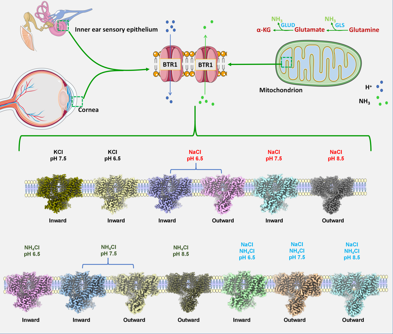 SLC4转运蛋白家族在维持细胞内外的离子平衡与酸碱稳态中扮演着核心角色。BTR1(Bicarbonate Transporter Related protein-1)是该家族的重要成员,早期研究提示其可能转运硼酸盐,后续功能研究将其定义为一种NH₃/H⁺共转运体。它在调节细胞内外酸碱平衡、氨代谢与排泄、以及维持肾脏、神经系统和视觉功能等方面至关重要,其功能异常已被证实与角膜营养不良、听力损失及神经系统障碍等多种疾病密切相关。尽管已有研究揭示了BTR1的部分功能及其受PIP2调控的构象变化机制,但其底物选择性与动态转运过程仍不明确。