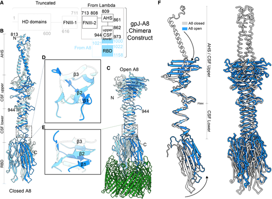 研究团队利用冷冻电镜技术,解析了A8 gpJ713(3.49 Å)及A8 gpJ713与宿主外膜蛋白OmpC结合(3.84 Å)下的结构(图1)。结构分析显示,当A8 gpJ713与OmpC结合后,远端RBD结构域深入OmpC的中央孔道,触发了RBD刚体运动,进一步驱动了CSF结构域中β1和β2链的位移,使其与β3链形成稳定的氢键,启动信号向上传递,最终诱导AHS结构域发生约180°的翻转,折叠至CSF结构之上引发感染。这一结果表明,受体结合并非简单的局部界面接触,而是一个协同的整体构象级联过程。