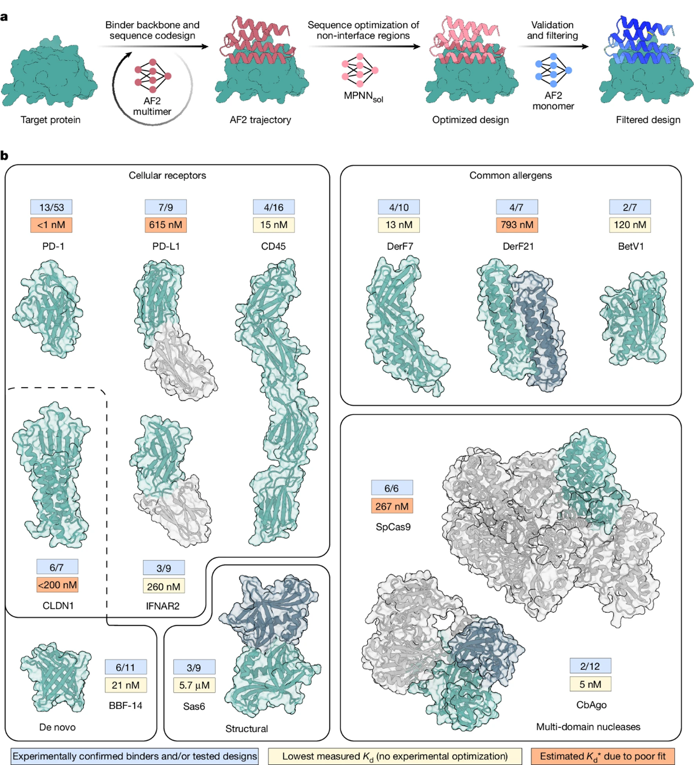 来自瑞士洛桑理工学院的Bruno E. Correia和Martin Pacesa以及美国麻省理工学院的Sergey Ovchinnikov团队合作提出 BindCraft:一个开源、全自动的从头蛋白结合体设计流程,在实验中的成功率可达 10–100%。BindCraft 利用 AlphaFold2的权重,即使在缺乏已知结合位点的情况下,也无需高通量筛选或额外的实验优化,便可生成纳摩尔级亲和力的结合体。研究者成功针对一组多样且具挑战性的靶标设计出结合体,包括细胞表面受体、常见过敏原、从头设计蛋白以及多结构域核酸内切酶(如 CRISPR–Cas9)。研究者进一步展示了这些设计结合体在功能与治疗方面的潜力:它们能够在患者来源样本中降低 IgE 对桦树过敏原的结合,调控 Cas9 的基因编辑活性,并降低一种食源性细菌肠毒素的细胞毒性。最后,利用受体特异性的细胞表面结合体,将腺相关病毒(AAV)衣壳重定向用于靶向基因递送。该工作标志着向“one design–one binder”计算设计范式迈出的重要一步,并在治疗、诊断与生物技术领域具有巨大的应用潜力。