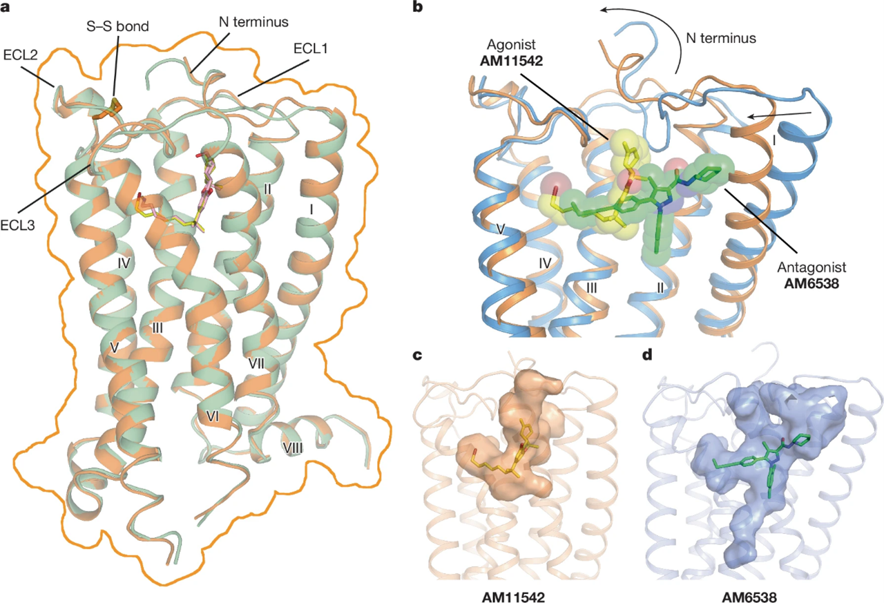 来自上海科技大学大学刘志杰以及赵素文,美国东北大学的Alexandros Makriyannis,斯克里普斯研究所的Laura M. Bohn合作报道了两种激动剂结合的人源 CB1 晶体结构:分别是与四氢大麻酚衍生物 AM11542 和与六氢大麻酚衍生物 AM841 的复合物。与拮抗剂结合状态²相比,这两个 CB1–激动剂复合物揭示了整体构象上的显著变化,包括配体结合口袋体积减少 53%,以及 G 蛋白结合区域表面积的增加。此外,还首次在实验中观察到 Phe2003.36 与 Trp3566.48 的“双重开关”构象切换(上标为 Ballesteros–Weinstein 编号),这一机制似乎对受体激活至关重要。这些结构为理解 CB1 的激活机制 提供了重要见解,并为预测 Δ9-THC 以及内源性与合成大麻素的结合模式提供了分子基础。CB1 结合口袋的 可塑性 似乎是某些 A 类 G 蛋白偶联受体的共同特征。这些发现有望推动化学多样性配体的设计,以获得具有不同药理学特性的化合物。