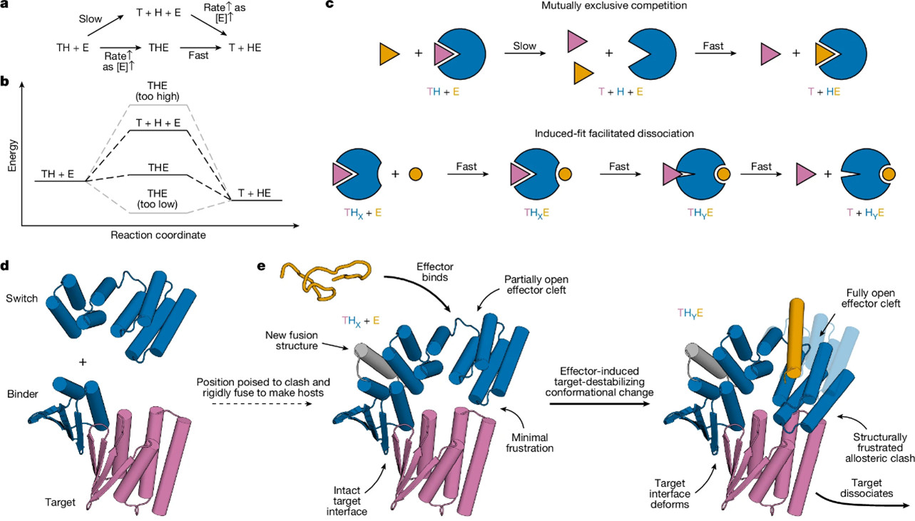 来自美国华盛顿大学的David Baker和Adam J. Broerman以及奥地利科学技术研究所的Florian Praetorius团队合作提出了一种通用策略:通过诱导契合的动力冲程,生成结构受挫且受限的激发态,从而别构性地驱动蛋白质复合物的解离。X射线晶体学、双电子–电子共振(DEER)谱和动力学结合测量表明,激发态的引入使得设计的效应子可诱导解离速率最高增加至 5700 倍。研究者通过设计快速生物传感器、动力学可控电路和能够在数秒内与受体解离的细胞因子模拟物,展示了该方法的威力,从而能够解析白细胞介素-2 信号传导的时间动态过程。