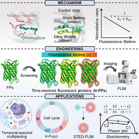 来自西湖大学张鑫团队提出了一类具有合理控制寿命的时间分辨荧光蛋白(tr-FPs)。通过一种在不改变荧光蛋白光谱的前提下调控寿命的策略,研究者开发出一系列覆盖可见光谱并具有广泛寿命范围的 tr-FPs。这些 tr-FPs 被应用于时域-光谱分辨显微成像,能够在活细胞中同时成像 9 种不同的蛋白质,并将多种活性与细胞周期相关联。此外,tr-FPs 还能实现多路超分辨显微成像,利用生命周期信号同时观察 4 种蛋白质,并被用于定量测定细胞蛋白质的化学计量比。本研究引入了 tr-FPs 的概念与开发,作为一种变革性的工具集,为将系统复杂性与定量精确性相结合融入生物学研究提供了新机遇。
