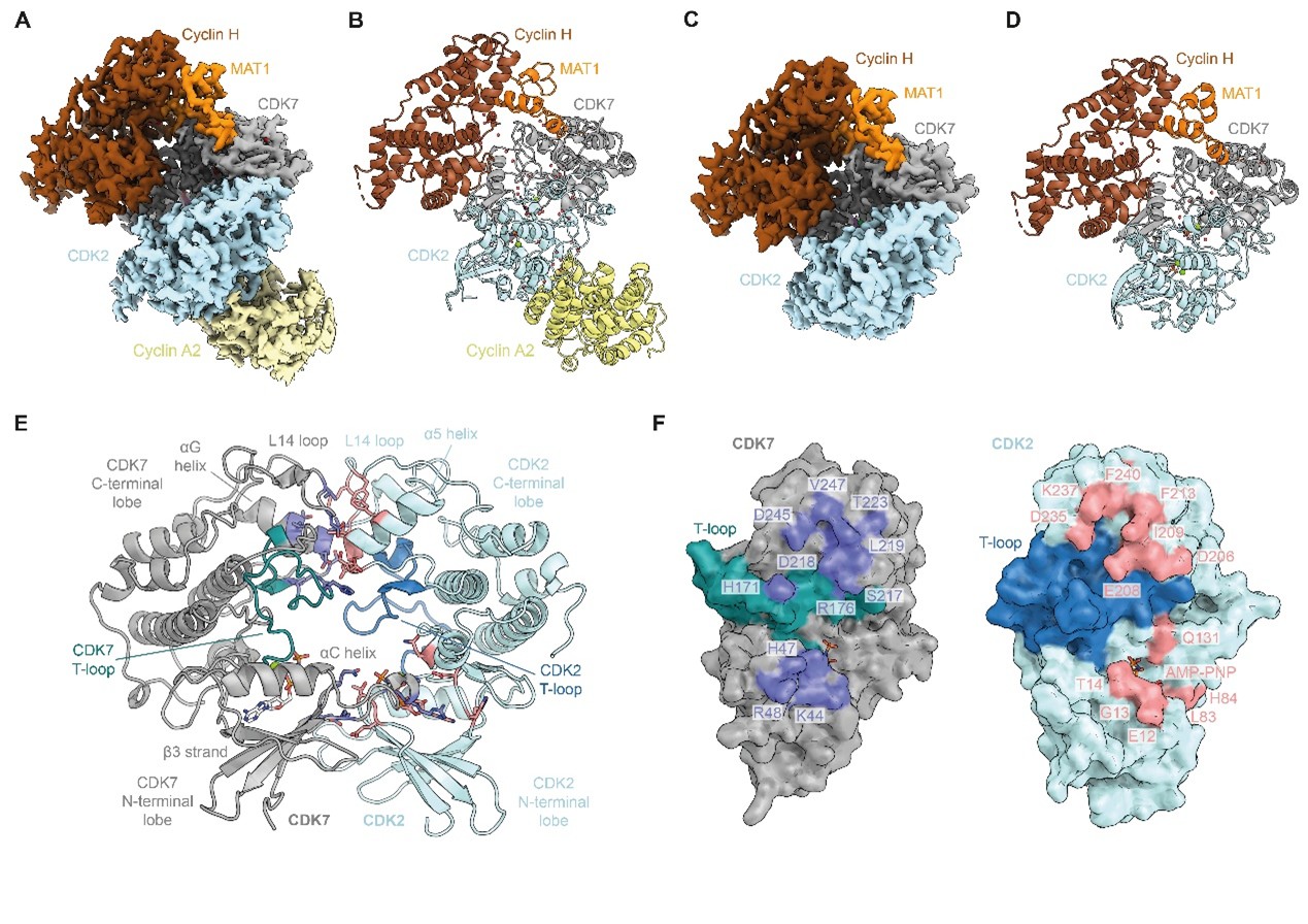 来自英国伦敦癌症研究院的Basil J. Greber课题组利用冷冻电镜解析了 CAK 与 CDK2 以及 CDK2-cyclin A2 复合物的高分辨率结构。这些结构揭示了一种不依赖 T-loop 的激酶-激酶界面,其两侧激酶结构域均参与了相互作用。通过计算分析以及解析 CAK 与 CDK1-cyclin B1 及 CDK11 的复合物结构,研究者发现这些结构代表了 CAK-CDK 复合物的通用构架。这些结果拓展了我们对细胞周期调控及激酶信号级联机制的理解。