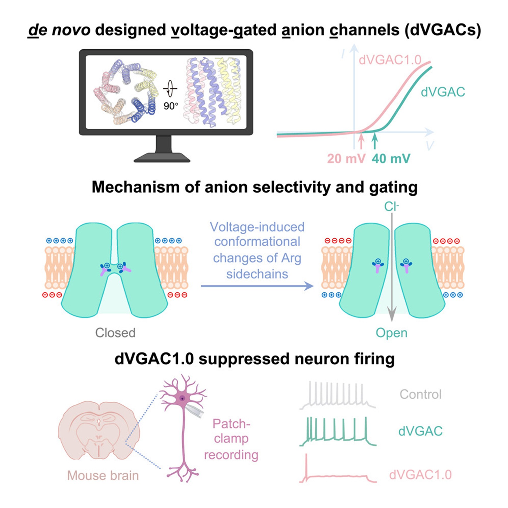 来自西湖大学卢培龙研究团队,联合西湖实验室/西湖大学李波、黄晶课题组合作从头精确设计了电压门控阴离子通道(de novo Voltage-Gated Anion Channels, dVGACs)。这些dVGACs采用由15个α螺旋组成的五聚体结构,在跨膜区域形成精确布置的精氨酸收缩区(arginine constrictions)。在膜片钳实验中,dVGACs 展现出电压依赖性的阴离子电流。冷冻电镜结构结果与设计模型高度一致。结合冷冻电镜结构与分子动力学模拟发现,精氨酸收缩区会发生电压诱导的构象变化,正如设计所预期的那样,同时充当电压传感器与选择性过滤器。值得注意的是,通过定点突变可以精确调控 dVGACs 的阴离子选择性与电压敏感性,从而在原位条件下实现抑制神经元放电的功能。这一成果展示了通过合理设计实现具有特定构象变化的离子通道的能力,不仅刷新了我们对膜生物物理学的理解,也为多种潜在应用(如神经调控与生物传感)开辟了新的方向。