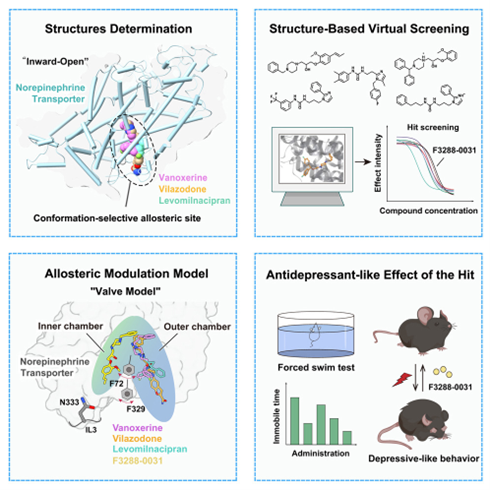 通过对NET与左米那普仑、伐诺司林和维拉佐酮的复合物进行冷冻电镜分析,来自中国科学院上海药物研究所徐华强、杨德华,联合临港实验室蒋轶、王震团队共同发现了NET内侧前庭中一个先前未定义的别构位点,该位点使构象选择性调节成为可能。这个发现提出了一个“阀门模型”,在该模型中,特定残基将细胞质腔分割成不同的腔室,决定了抑制剂的结合特异性。通过虚拟筛选,研究者利用这一结构见解,发现了一组具有NET抑制活性的抑制剂,并展示了它们的抗抑郁作用。此外,研究者对抑制剂在这一构象选择性位点上的占据的结构鉴定,为靶向治疗干预提供了一个机制框架。这些发现加深了我们对NET别构调节的理解,提供了一个结构引导的框架,用于开发下一代抗抑郁药物,针对NET的向内开放构象,以治疗神经精神疾病。
