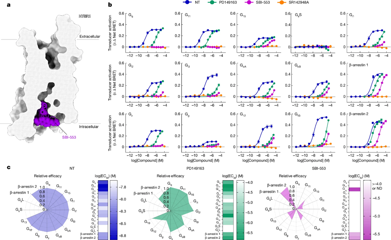 来自美国明尼苏达大学Lauren M. Slosky课题组以典型的A类GPCR神经肽受体1(NTSR1)为例,展示了与GPCR-转导蛋白接口结合的小分子通过亚型特异性和可预测的机制改变G蛋白耦合,进而实现结构引导的药物设计。研究者发现,细胞内核心结合化合物SBI-553通过直接的分子间相互作用改变NTSR1的G蛋白偏好,促进或防止与特定G蛋白亚型的结合。对SBI-553骨架的修改产生了具有不同G蛋白选择性谱的变构调节剂。选择性谱与探针无关,在不同物种中保持一致,并且转化为体内活性的差异。研究表明,G蛋白选择性可以通过对单一化学骨架的小幅改动,针对受体-转导蛋白接口来量身定制。此外,鉴于这一口袋在广泛物种中保守,此发现可能为通路选择性药物发现提供了一种策略,这一策略适用于多样化的GPCR超家族。