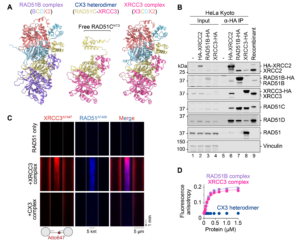 来自英国伦敦弗朗西斯·克里克研究所Stephen C. West和Luke A. Greenhough团队合作展示了RAD51副本组装成两个不同的异四聚体复合物,分别是RAD51B-RAD51C-RAD51D-XRCC2(RAD51B复合物)和XRCC3-RAD51C-RAD51D-XRCC2(XRCC3复合物)。RAD51B复合物促进RAD51丝状结构的动态腺苷三磷酸水解依赖性组装,而XRCC3复合物则稳定地覆盖RAD51丝的5′端,以促进同源配对,正如通过冷冻电镜观察到的那样。这些复合物在进化过程中高度保守,揭示了DNA修复和复制叉稳定化过程中RAD51丝形成与封端的机制。
