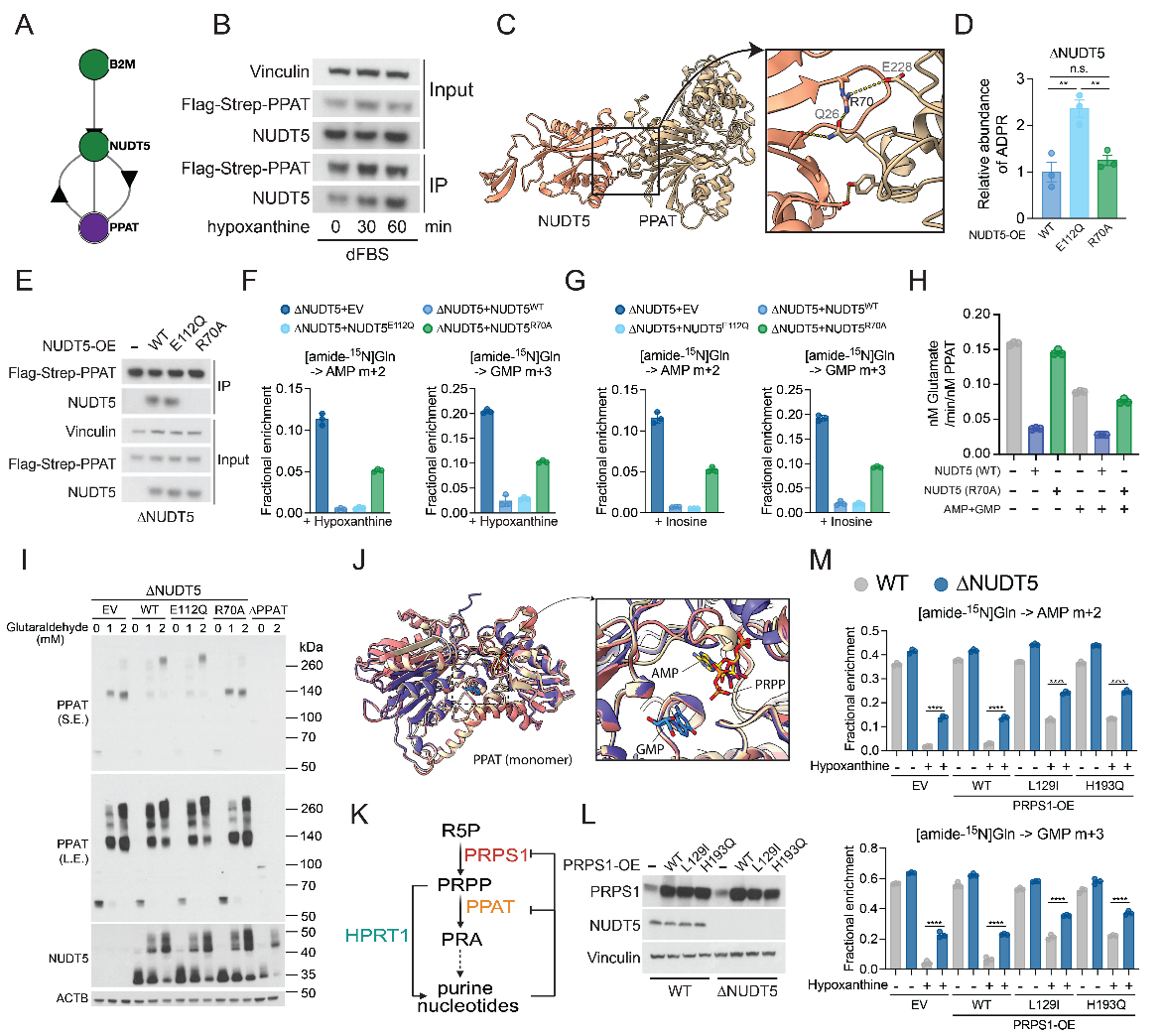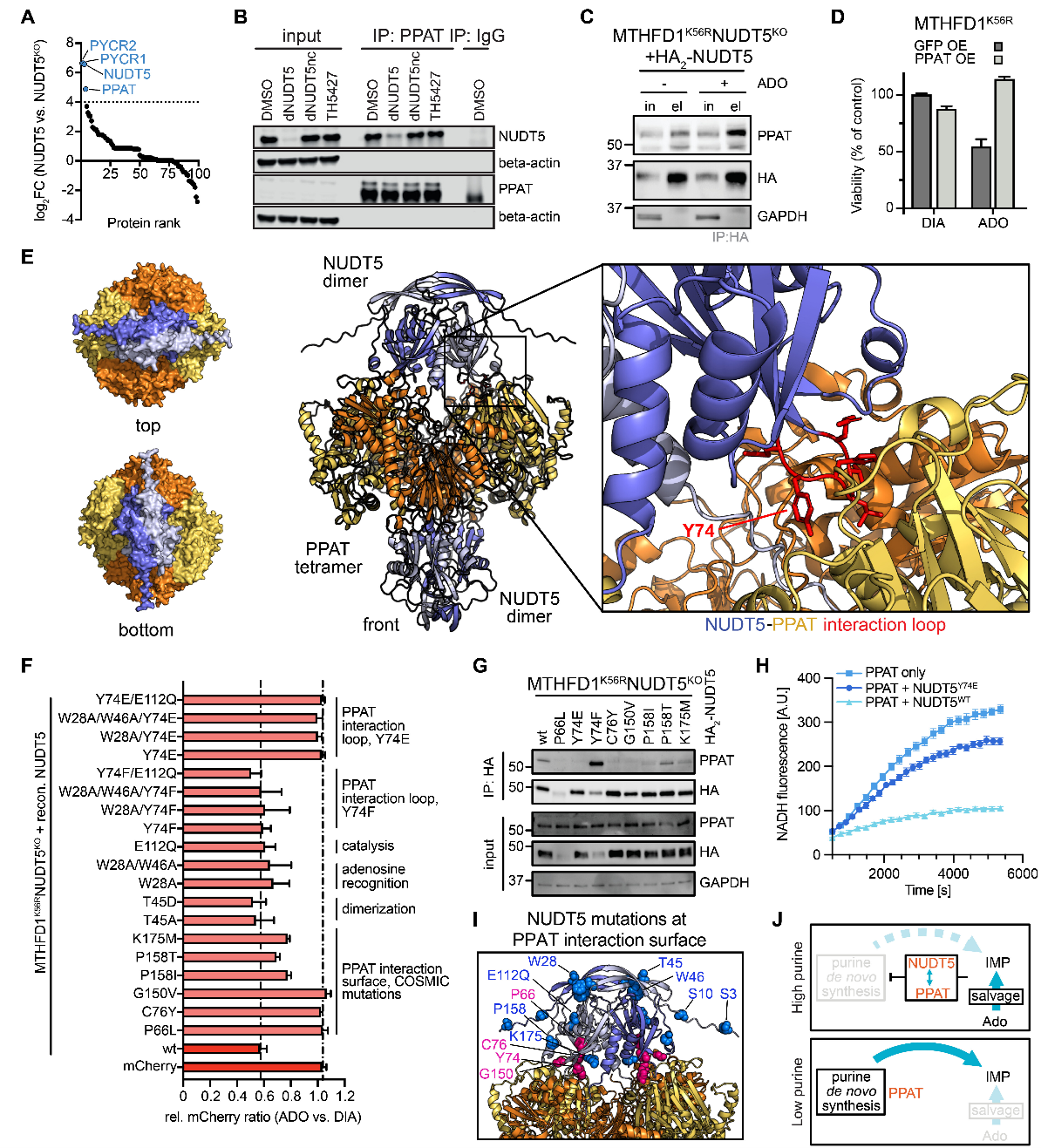 来自美国德克萨斯大学西南医学中心的Ralph J. DeBerardinis课题组鉴定出Nudix水解酶5(NUDT5)作为DNPB的调节因子。在嘌呤回收过程中,NUDT5通过与磷酸核糖基焦磷酸氨基转移酶(PPAT)相互作用来抑制DNPB,而不依赖其催化功能,PPAT是DNPB途径中的限速酶。NUDT5-PPAT的相互作用促进了PPAT的寡聚化,抑制了PPAT的酶活性,并促进了嘌呤体的解体,嘌呤体是一个在DNPB中起作用的代谢体。破坏NUDT5-PPAT相互作用克服了嘌呤回收过程中的DNPB抑制,允许过度的DNPB并诱导硫嘌呤抗性。因此,NUDT5调控DNPB和回收之间的平衡,以维持适当的细胞内嘌呤核苷酸浓度。