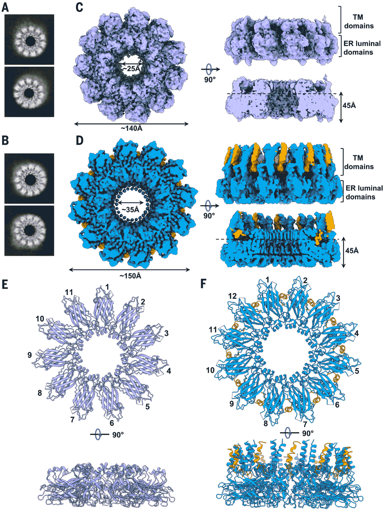 来自美国德克萨斯大学西南医学中心的Philipp E. Scherer以及芬兰赫尔辛基大学Elina Ikonen课题组合作报道了 seipin–Adig 复合物的结构,其整体分辨率约为 3.0 Å。结构结果显示,哺乳动物 seipin 可组装成两种不同的寡聚形式:十一聚体和十二聚体。Adig 选择性地结合于十二聚体形式,通过连接并稳定相邻亚基来增强 seipin 的组装。从功能上看,该复合物在脂滴发育的早期和晚期阶段均起到促进作用。在转基因小鼠中,脂肪细胞特异性过表达 Adig 可增加脂肪质量并导致脂滴体积增大,而删除 Adig 则破坏了棕色脂肪组织中的甘油三酯积累。因此,Adig 可通过与 seipin 的结构和功能相互作用调节脂质储存。