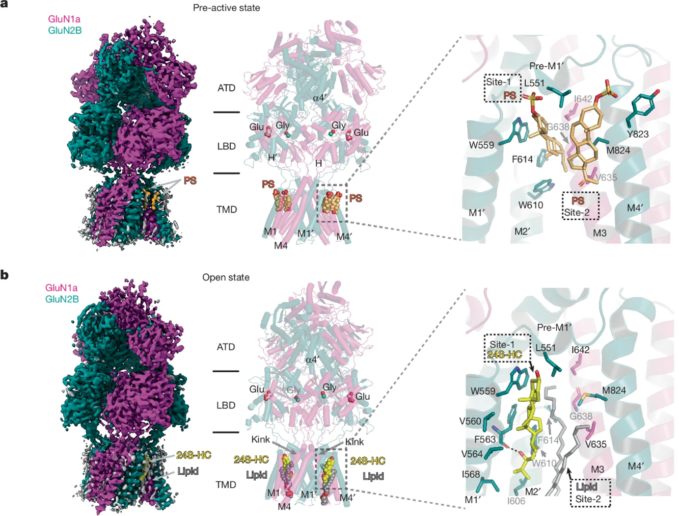 来自美国冷泉港实验室Hiro Furukawa课题组研究发现,在异源四聚体神经元通道 GluN1a–2B 型 N-甲基-D-天冬氨酸受体(NMDAR)中,电导水平由形成孔道的跨膜螺旋弯曲模式控制。通过单颗粒冷冻电镜分析,研究者发现内源性神经类固醇及其合成正向变构调节剂 24S-羟基胆固醇(24S-HC)结合于 GluN2B 亚基的膜邻近口袋,稳定了完全开放的门控构象,此时 GluN1a 的 M3 螺旋与 GluN2B 的 M3′ 螺旋均发生弯曲,使通道孔径扩大。而小分子 EU1622-240 同样结合于 GluN2B 口袋,并额外结合到 GluN1a 的另一膜邻近口袋,从而稳定部分开放状态,仅有 GluN2B 的 M3′ 螺旋弯曲。与不同的门控开放程度相对应,单通道记录显示 24S-HC 诱导完全电导状态,而 EU1622-240 则以亚电导状态为主。另一种神经类固醇硫酸孕烯醇酮(pregnenolone sulfate)也结合于类似的 GluN2B 口袋,但可同时结合两分子,显示出多样的神经类固醇识别模式。综上,研究揭示膜邻近口袋是调控 NMDAR 电导水平的关键结构枢纽。