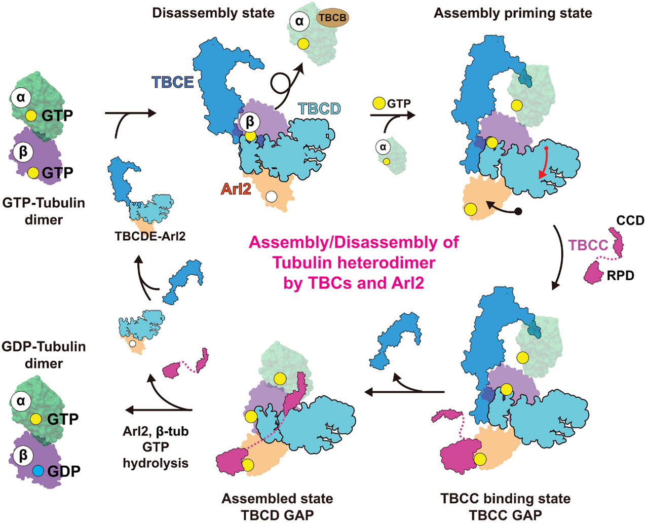 来自韩国首尔国立大学的Soung-Hun Roh课题组利用冷冻电镜解析了人源 TBCD、TBCE、TBCC 以及 GTP 酶 Arl2 如何介导 αβ-微管蛋白的组装与解离。研究捕获了多个构象状态,揭示了这些辅助因子协同调控微管蛋白异二聚体生成的全过程。其中,TBCD 稳定单体 β-微管蛋白,并为其他辅助因子提供支架;Arl2 结合 GTP 后发生构象变化,从而在组装与解离状态之间切换。TBCD 与 TBCE 共同引导 α-与 β-微管蛋白形成部分组装的界面,而 TBCC 则充当分子“钳子”,完成异二聚体的最终装配。此外,TBCD 还作为 β-微管蛋白的 GTP 酶激活蛋白(GAP)。β-微管蛋白的 GTP 水解与 Arl2 的 GTP 酶活性相耦联,建立了一个“检查点”,确保只有完全成熟的异二聚体才能进入后续过程。这些发现为微管蛋白异二聚体的生成与循环再利用提供了结构学框架,从而阐明了支撑细胞骨架蛋白稳态(cytoskeletal proteostasis)的分子机制。