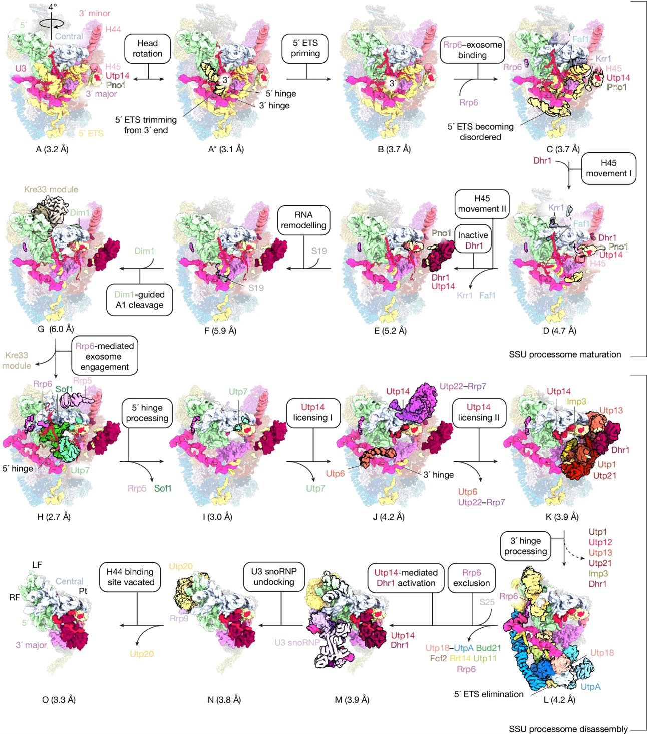 真核生物核糖体小亚基(SSU)的组装依赖于 SSU 加工体(SSU processome),这是一种含有 RNA 分子伴侣 U3 小核 RNA(snoRNA) 的核仁前体复合物。然而,由于缺乏中间体结构,关于 SSU 加工体在成熟、重塑、解离以及 RNA 质量控制过程中的分子机制及其状态转变仍然不清楚。