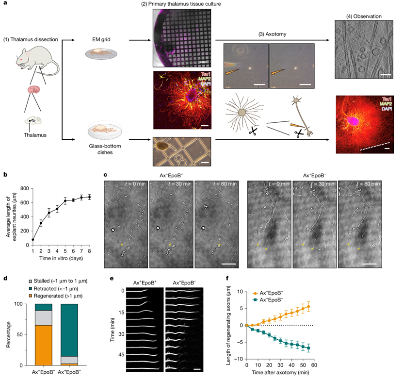 为研究损伤后的细胞内响应,来自美国国立卫生研究院Naoko Mizuno团队开发了一套原位冷冻电子断层扫描(cryo-ET)与冷冻电镜(cryo-EM)平台,用于模拟轴突损伤,并揭示药物表艾泊霉素B(epothilone B)诱导丘脑轴突再生的结构机制。研究者观察到,被稳定化的微管会向损伤部位之外延伸,产生膜张力并推动膜扩张。冷冻电镜以 3.19 Å 分辨率解析了轴突再生前沿微管的原位结构,显示 epothilone B 嵌入并结合于微管晶格之中。在修复过程中,微管蛋白簇被输送至再生区域,并被纳入正在延伸的微管中。这些“微管芽”(microtubule shoots)作为支架,可承载多类型囊泡和内质网,从而促进轴突修复所需物质的供应,直至膜张力恢复正常。研究者证明了神经元细胞具备一种出乎意料的能力:能够适应 epothilone B 诱导的机械拉伸,从而打破细胞内稳态并激活轴突进入再生模式。