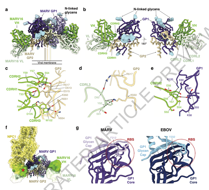 来自美国华盛顿大学的David Veesler和来自瑞士Humabs Biomed SA公司的Fabio Benigni团队合作通过设计突变来提升前融合构象的 MARV 糖蛋白(glycoprotein, GP)三聚体胞外结构域的表达量、热稳定性和免疫原性,而该蛋白是所有正在开发的中和抗体和疫苗的唯一靶点。研究人员发现了一种全人源、广谱抗马尔堡病毒的单克隆抗体 MARV16,其能够广泛中和所有 MARV 毒株,以及 Ravn 病毒与德宏病毒,并且其中和效力相较于先前报道的抗体提高了 40 到 100 倍。此外,MARV16 能在受到 MARV 攻击的小鼠豚鼠模型中提供治疗性保护。研究者解析了 MARV16 结合于 MARV GP 的冷冻电镜结构,显示 MARV16 识别前融合特异性的表位,该表位跨越 GP1 和 GP2,从而阻断受体结合并阻止病毒进入所必需的构象变化。研究者进一步揭示了 MARV GP glycan cap 的结构特征,该结构遮蔽了受体结合位点(RBS),并强调其与进化关系较远的丝状病毒 GP 之间的结构相似性。值得注意的是,MARV16 与已报道的 RBS 定向抗体可同时结合 MARV GP。这些抗体组合使病毒必须获得多位点突变才能同时逃逸两类抗体的中和作用,为未来能够抵抗病毒演化的 MARV 治疗策略奠定基础。对 MARV GP 的稳定化改造以及 MARV16 的发现,为 MARV 的预防与治疗提供了新的可能性。