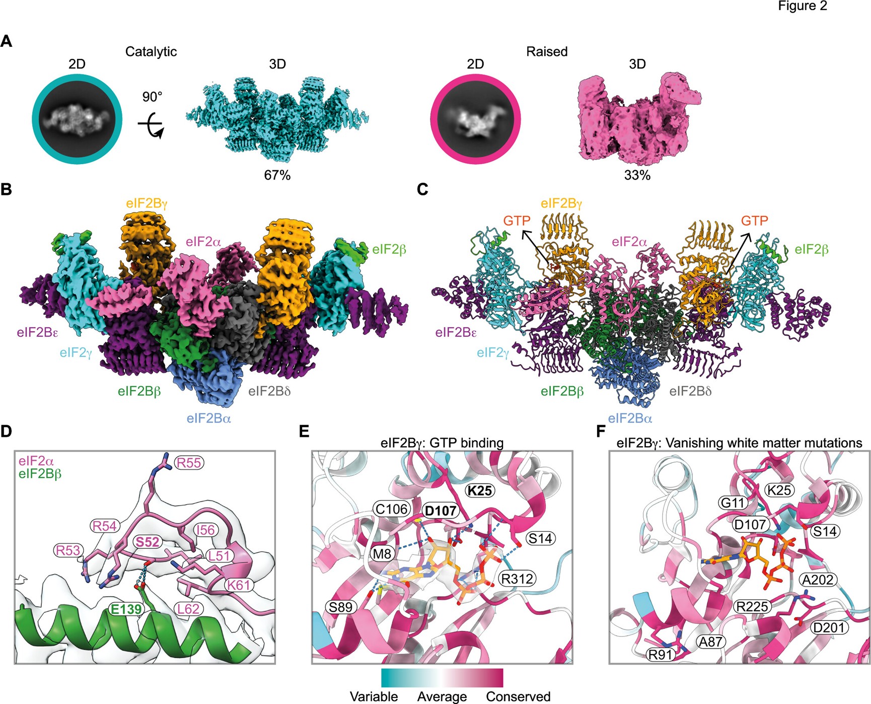 来自英国MRC的Anne Bertolotti团队发现 eIF2 磷酸酶亚基 PPP1R15A 和 PPP1R15B(R15B) 可与 P-eIF2–eIF2B 复合物共同结合。基于 R15B 结合的天然 eIF2–eIF2B 和 P-eIF2–eIF2B 冷冻电镜结构并通过生化实验验证,研究者证明了 R15B 能够促使本来无法被去磷酸化的 P-eIF2 在 eIF2B 上实现去磷酸化。这一发现阐明了 ISR 的终止机制:R15B 通过拯救 eIF2B 免受 P-eIF2 的抑制,从而维持翻译过程和细胞适应性。